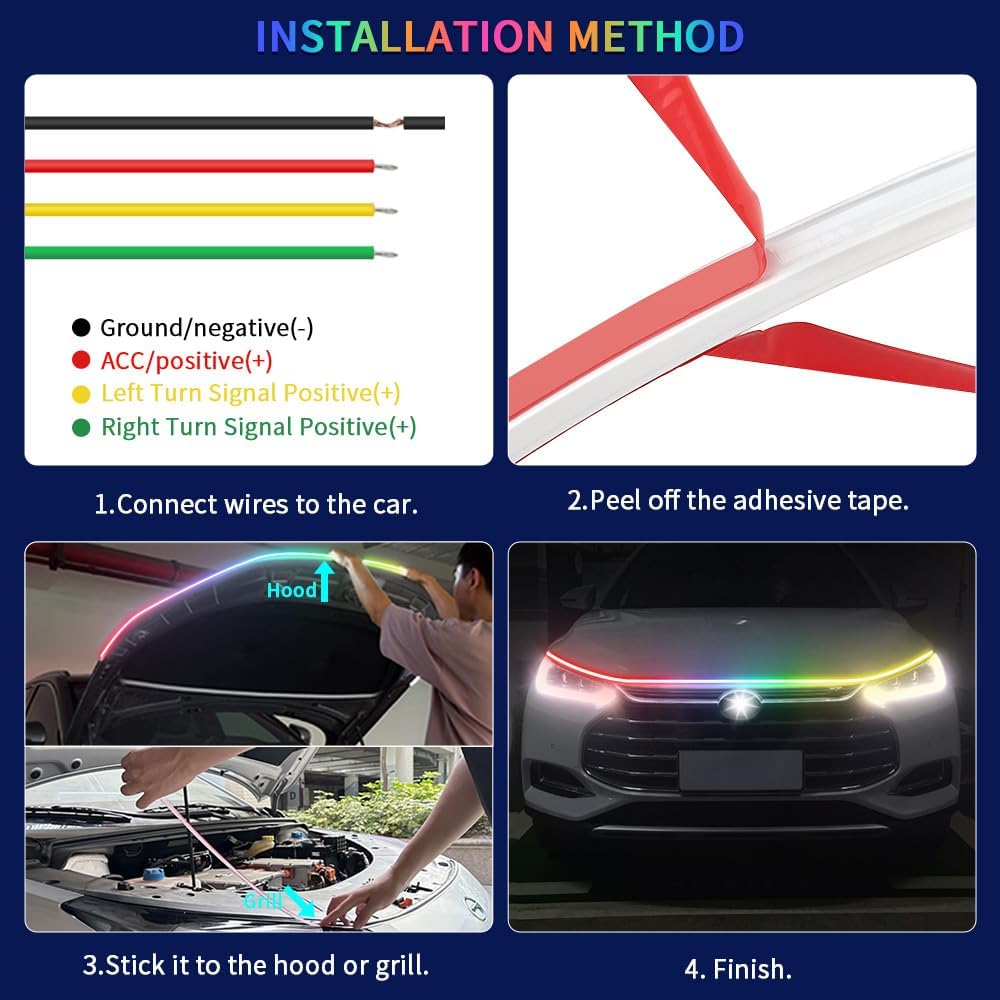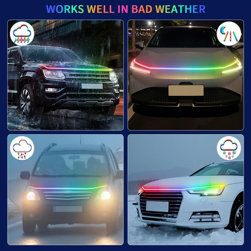 - DRL+Turn Signal Modes: Our LED hood light strip is different from traditional ones because it combines both DRL and turn signal functions, improving the driving experience. The RGB color emitted by the car hood light strip ensures clear and safe visibility while driving. Once the turn signal is activated, the hood light changes smoothly to a flowing amber color, thereby increasing visibility and attracting attention.