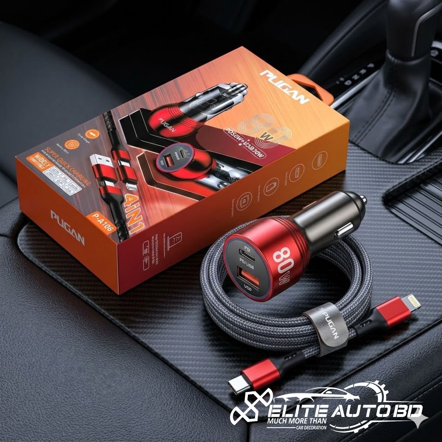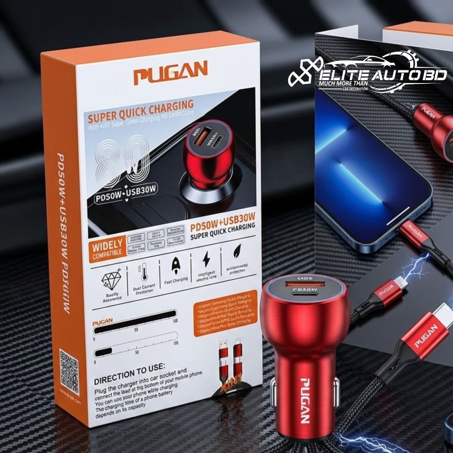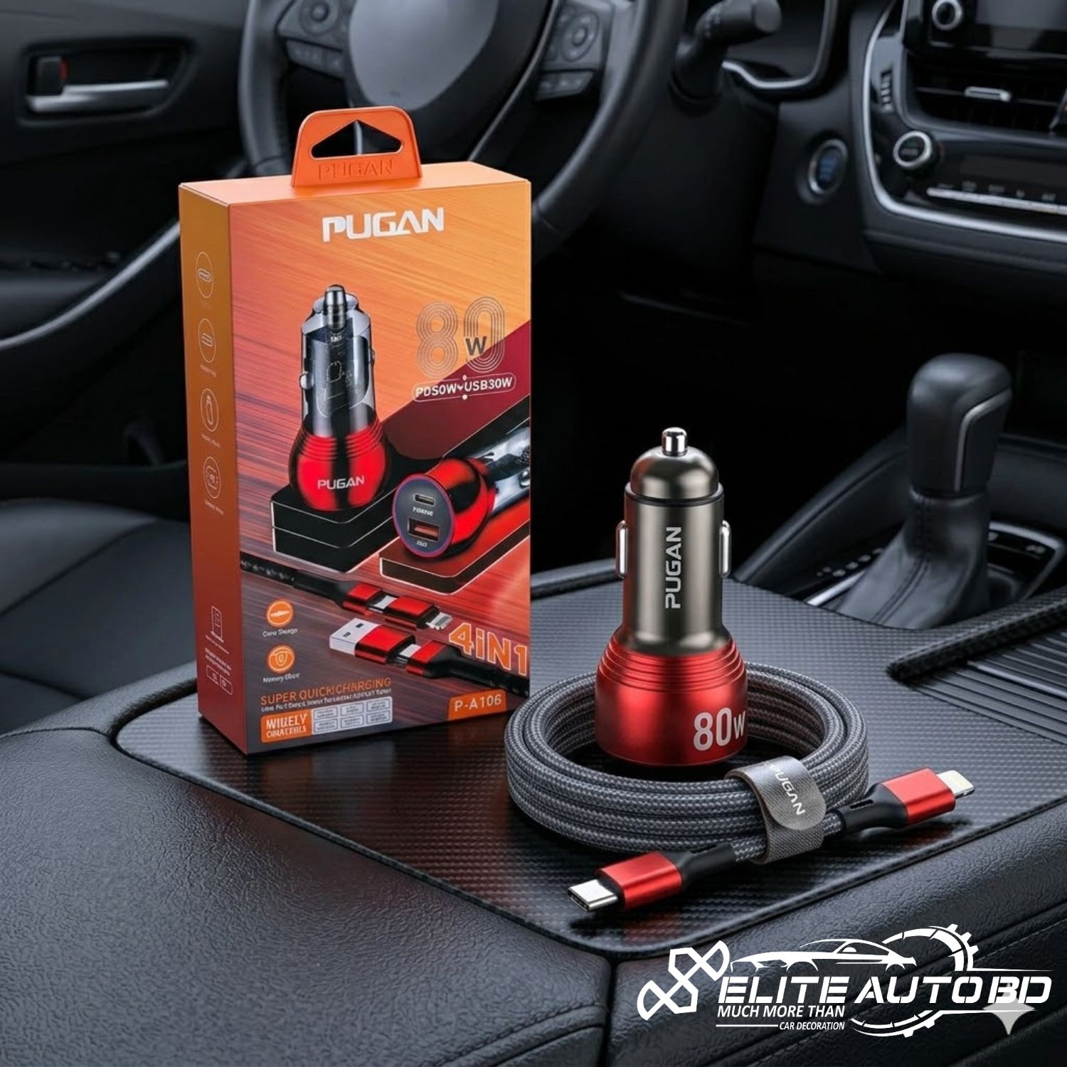 Pugan AG 50W PD Super Quick Car Charger: 4-in-1 Fast Charging USB Adapter for Samsung, iPhone, Xiaomi, Huawei | CHARGER | Elite Auto BD