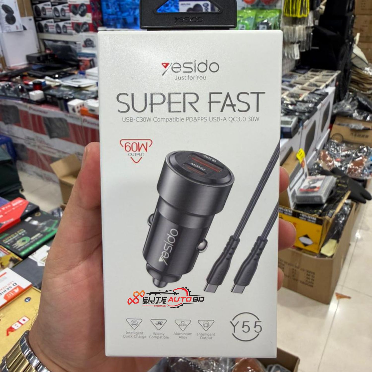 Yesido Y55 60W Super Fast Car Charger Suggested SEO Title: | Dual Port Fast Charging Adapter | Elite Auto BD